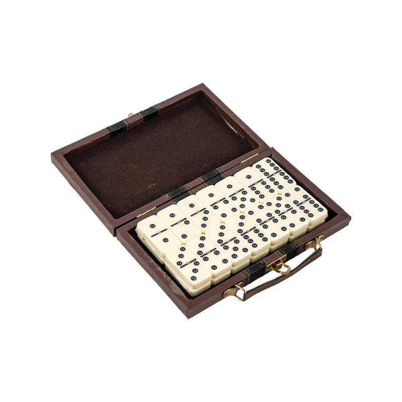 Dominó doble 6 marrón estándar en caja de cuero es un elegante y tradicional juego de mesa, perfecto para entretenimiento familiar y actividades sociales. El juego contiene 28 fichas estándar doble seis con puntos del 0 al 6. El diseño es sencillo e intuitivo, fácil de manejar y adecuado para jugadores de todas las edades. Cada ficha está cuidadosamente pulida con superficie lisa y bordes redondeados para asegurar un arreglo fluido durante el juego.
